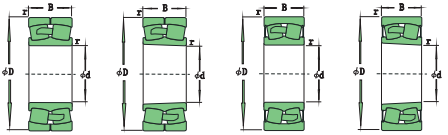 *在有两条滚道的内圈上和滚道为球面的外圈之间,装有鼓形滚子的轴承。外圈滚道面的曲率中心与轴承中心一致,所以具有自动调心功能,当轴或外壳出现绕曲时,可以自动调整,不增加轴承负担。调心滚子轴承可以承受较大的径向负荷,及两个方向的轴向负荷。调心滚子轴承配有圆柱孔和圆锥孔两种设计,在使用圆柱孔的轴承时可直接安装,使用圆锥孔时需要和紧定套配合使用。