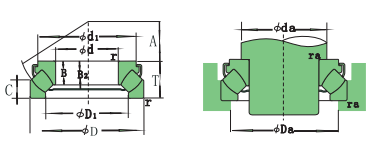 *推力调心滚子轴承,是鼓形滚子倾斜排列的推力轴承,坐圈滚道呈球面形,所以具有调心功能,由于接触面是鼓形滚子接触面大,可以承受较大的轴向负荷。保持架主要使用E”形钢板冲压和“M”铜保持架。